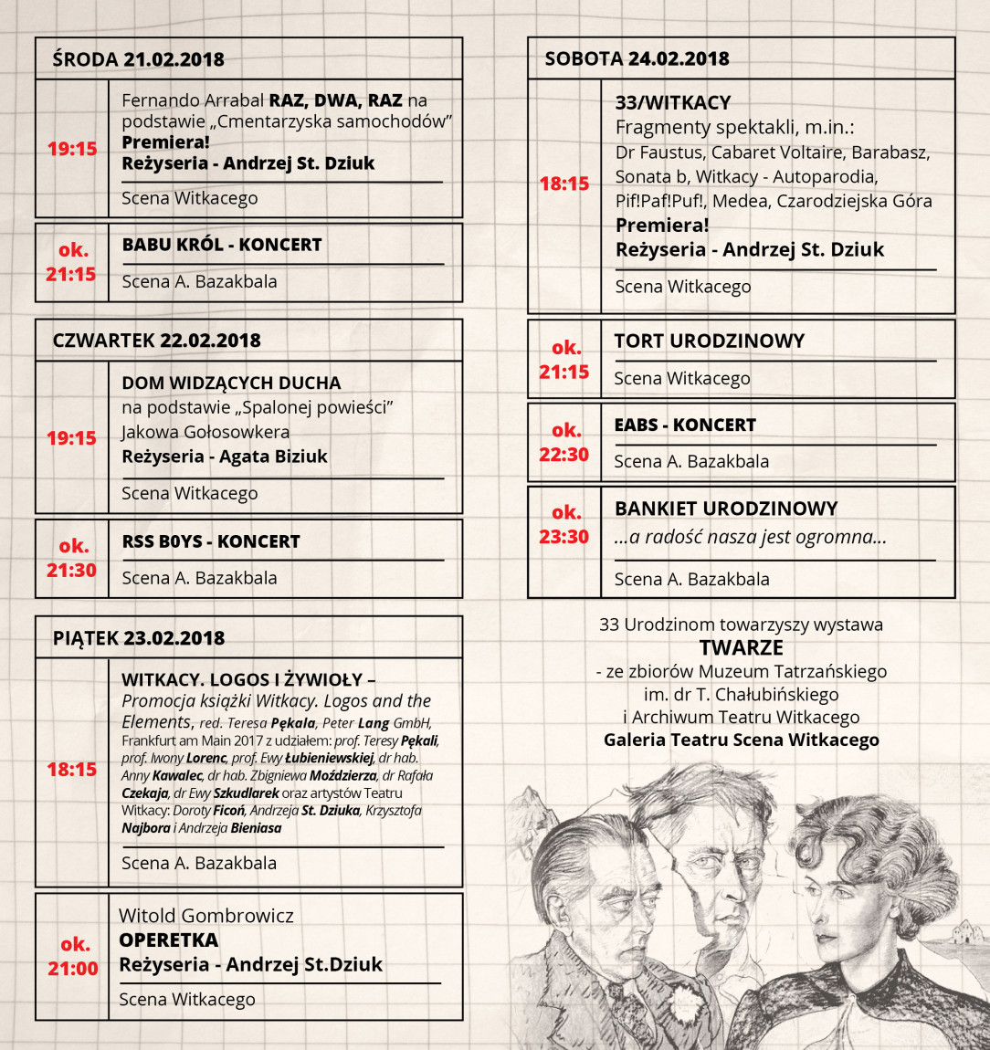 Kolejne premierowe przedstawienie to przygotowany specjalnie na Urodziny teatralny kolaż w reżyserii Andrzeja Dziuka "33/WITKACY - TEATR" czyli fragmenty spektakli m.in.: Dr Faustus, Cabaret Voltaire,Sonata b, Medea, Barabasz.