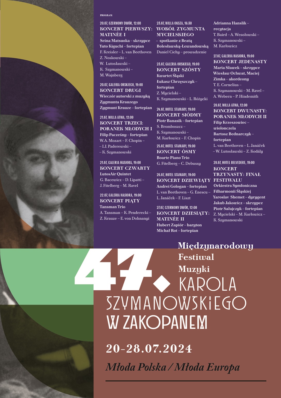 Trzon programowy 47. Festiwalu Muzyki Karola Szymanowskiego stanowią kompozycje patrona festiwalu oraz pozostałych członków grupy „Młoda Polska”. W tej edycji wyróżniona zostanie w sposób szczególny twórczość Mieczysława Karłowicza oraz Grzegorza Fitelberga, Przypomniana zostanie także postać Zygmunta Mycielskiego, kompozytora i teoretyka. Nie jest odkryciem, że świat końca XIX i pierwszych dekad XX wieku był epoką niezwykle dynamiczną pod każdym względem, również pod względem mnogości prądów stylistycznych w sztuce muzycznej. W zgodzie z ideą przewodnią Festiwalu „Młoda Polska. Młoda Europa” osnową programową będą więc dzieła nie tylko polskich twórców ale również kontekst europejski. Ważną rolę w takim odbiorze wydarzeń odgrywają przestrzenie, w których rozbrzmiewa muzyka. To często perły architektury drewnianej, z domem Szymanowskiego - Willą Atma na czele. To miejsca związane ze sztuką plastyczną, jak np. Galeria Władysława Hasiora, czy Galeria Sztuki w Willi Oksza, filie Muzeum Tatrzańskiego czy wreszcie galeria Orskiego. Wydarzenia największe - orkiestrowe - odbywać będą się w Hotelu Belvedere, który dysponuje salą z odpowiednią do muzycznych celów akustyką.