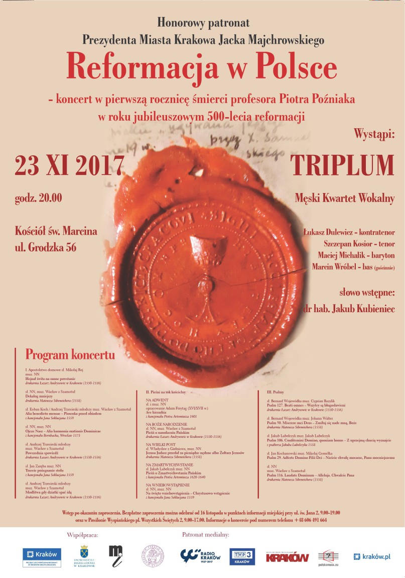 Podczas koncertu zaprezentowane zostaną pieśni z kancjonałów i psałterzy reformackich z XVI i XVII w. Wykonawcą muzycznych zabytków wokalnych będzie TRIPLUM Męski Kwartet Wokalny, a sylwetkę profesora przybliży dr hab. Jakub Kubieniec.