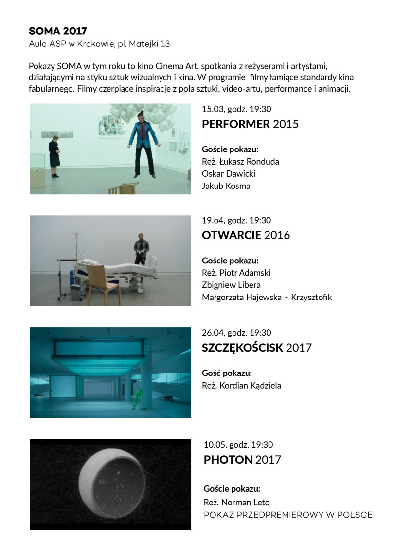 Pokazy SOMA w tym roku to spotkania z artystami i reżyserami działającymi na styku sztuk wizualnych i kina. Kino art house i cine art. Filmy łamiące standardy kina fabularnego, wykraczające poza utarte i przyjęte formuły. Autorskie filmy fabularne czerpiące inspiracje z pola sztuki, video-artu, performance i animacji.