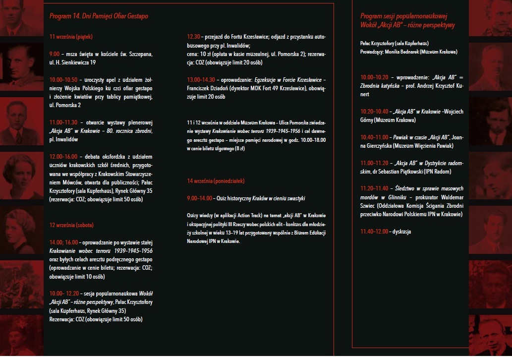 Jak co roku, już po raz czternasty, Muzeum Krakowa organizuje Dni Pamięci Ofiar Gestapo. W tym roku obchody odbędą się od 11 do 14 września. Tegoroczne obchody poświęcone będą 80. rocznicy Akcji AB, w wyniku, której Niemcy zamordowali ponad 6 tys. Polaków, głównie przedstawicieli inteligencji i elit politycznych. W samym Krakowie aresztowania Niemcy rozpoczęli już w marcu 1940 roku doraźny sąd policyjny wydawał wyroki śmierci, a skazanych rozstrzeliwano w podkrakowskich lasach. Najwięcej ofiar zamordowano w Forcie 49 „Krzesławice” i w lesie Glinik w Przegorzałach.