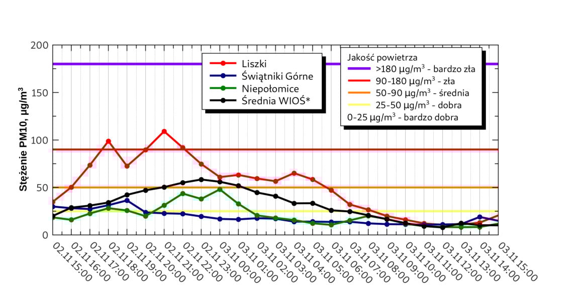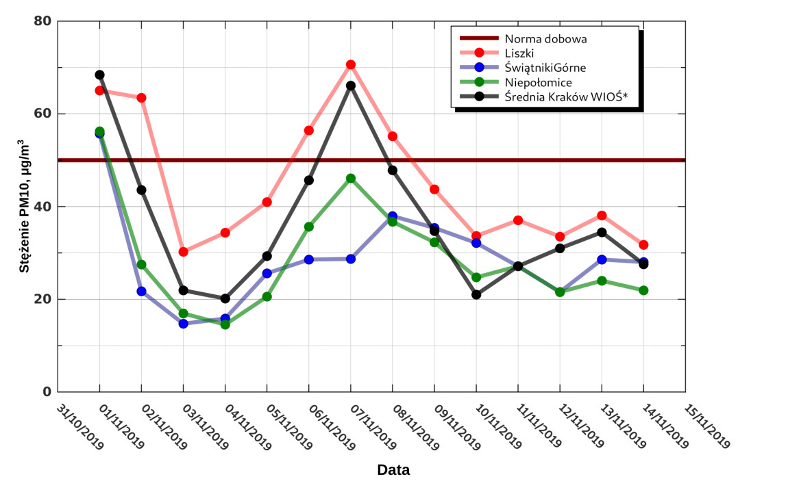 Podwyższone stężenia w okresach wieczornych i nocnych w dniach 6-8 listopada skutkowały przekroczeniem norm dobowych dla miejscowości Liszki. W pozostałych miejscowościach zaobserwowano podwyższenie wartości średnich dobowych w stosunku do całego okresu pomiarowego. Kolejne dni przyniosły kolejne ocieplenie oraz większe prędkości wiatru. W dniach 9-14 nie zaobserwowano przekroczenia normy dobowej.