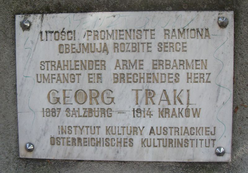 Pojawia się tu postać Georga Trakla - młodego austriackiego poety, który w wieku 27 jako porucznik i farmaceuta znalazł się na początku I wojny w Galicji. Tu trafił na leczenie psychiatryczne do szpitala wojskowego w Krakowie przy dzisiejszej ulicy Wrocławskiej. Tu też wybrał śmierć zamiast samotności. Przemycił z apteki kokainę i otruł się śmiertelną dawką. Było to 103 lata temu - 3 listopada 1914 roku o 9 wieczorem.