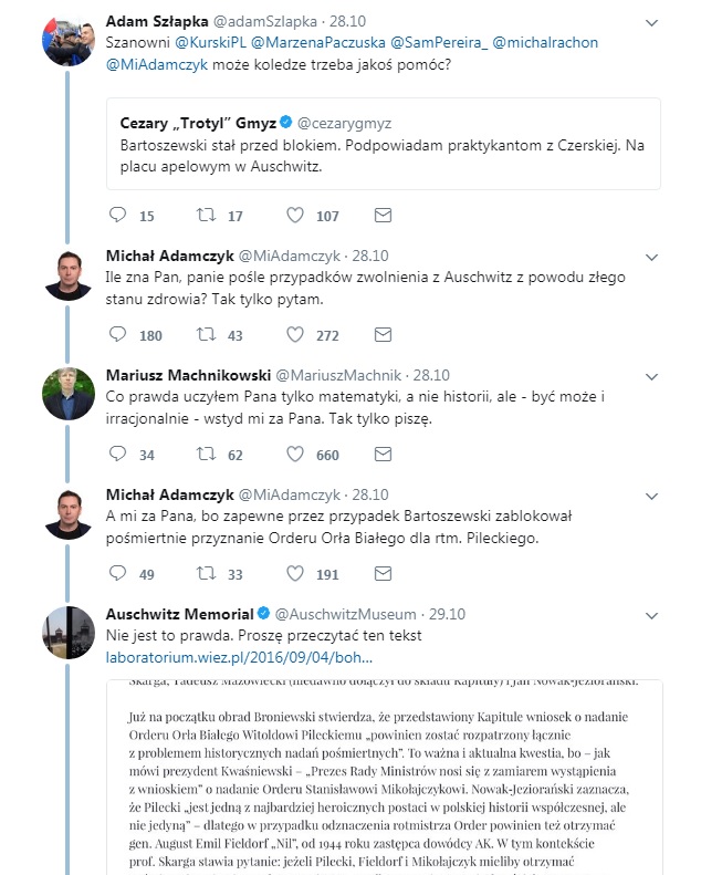 Przypomnijmy, Michał Adamczyk podczas dyskusji na portalu zapytał, ile jest znanych przypadków zwolnienia z Auschwitz z powodów zdrowotnych. Bartoszewski został zwolniony z obozu po długim pobycie w szpitalu obozowym. Dziennikarz sugerował też, że Władysław Bartoszewski zablokował pośmiertne przyznanie Orderu Orła Białego dla rotmistrza Pileckiego.