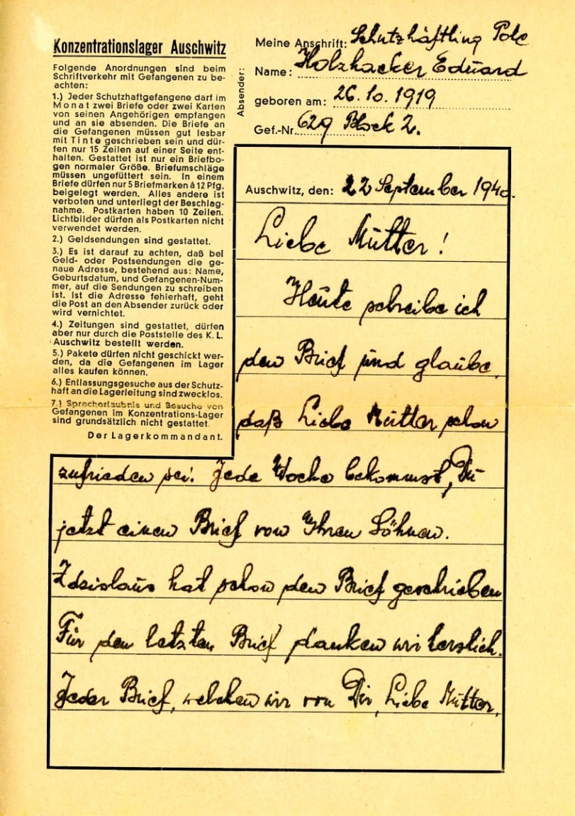 W zbiorach jest m.in. korespondencja obozowa Eryka Pawliczka, który zbiegło z Auschwitz 21 kwietnia 1944 r., a także list wysłany z tego obozu przez więźnia pierwszego transportu Polaków z 14 czerwca 1940 r. Edwarda Holzchakera.
