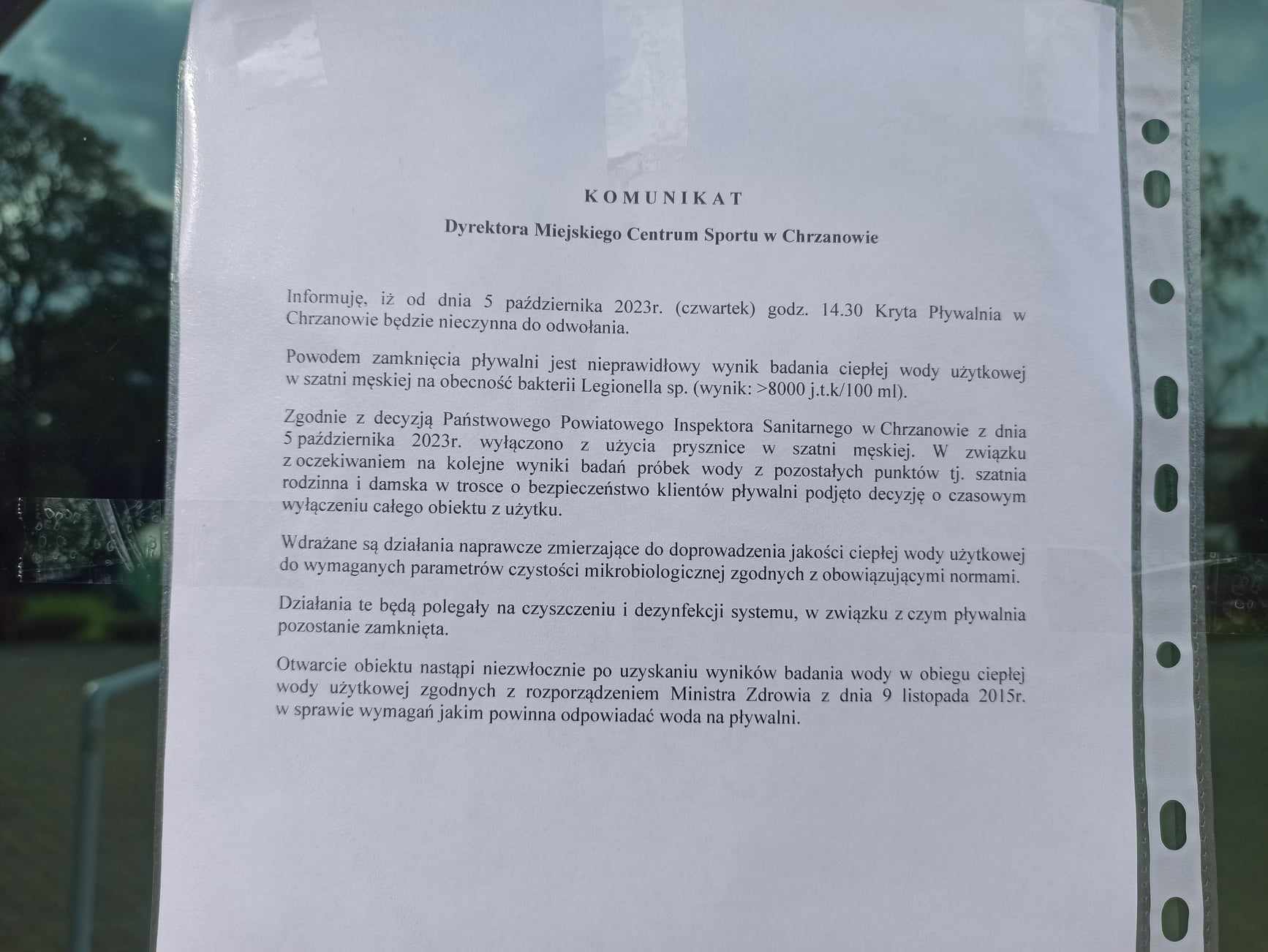 Basen został zamknięty do odwołania. Jak podaje Miejskie Centrum Sportu w Chrzanowie zarządzające basenem, otrzymano nieprawidłowy wynik badania ciepłej wody użytkowej w szatni męskiej na obecność bakterii Legionella.
