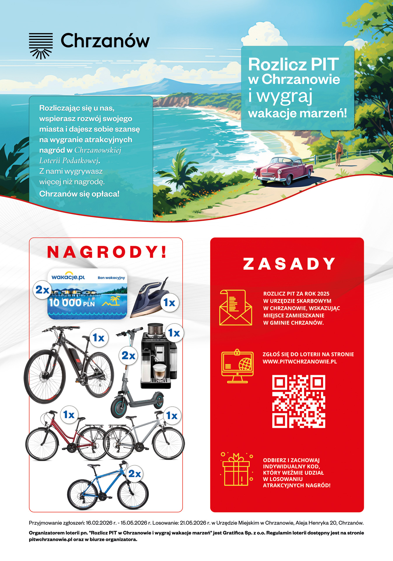 Kto może wziąć udział w zabawie? Jak wyjaśnia Agnieszka Bąk z Urzędu Miejskiego w Chrzanowie, szansę mają osoby pełnoletnie, które do 30 kwietnia 2026 roku złożą deklarację podatkową za 2025 rok w Urzędzie Skarbowym w Chrzanowie i wskażą w niej gminę Chrzanów jako miejsce zamieszkania.