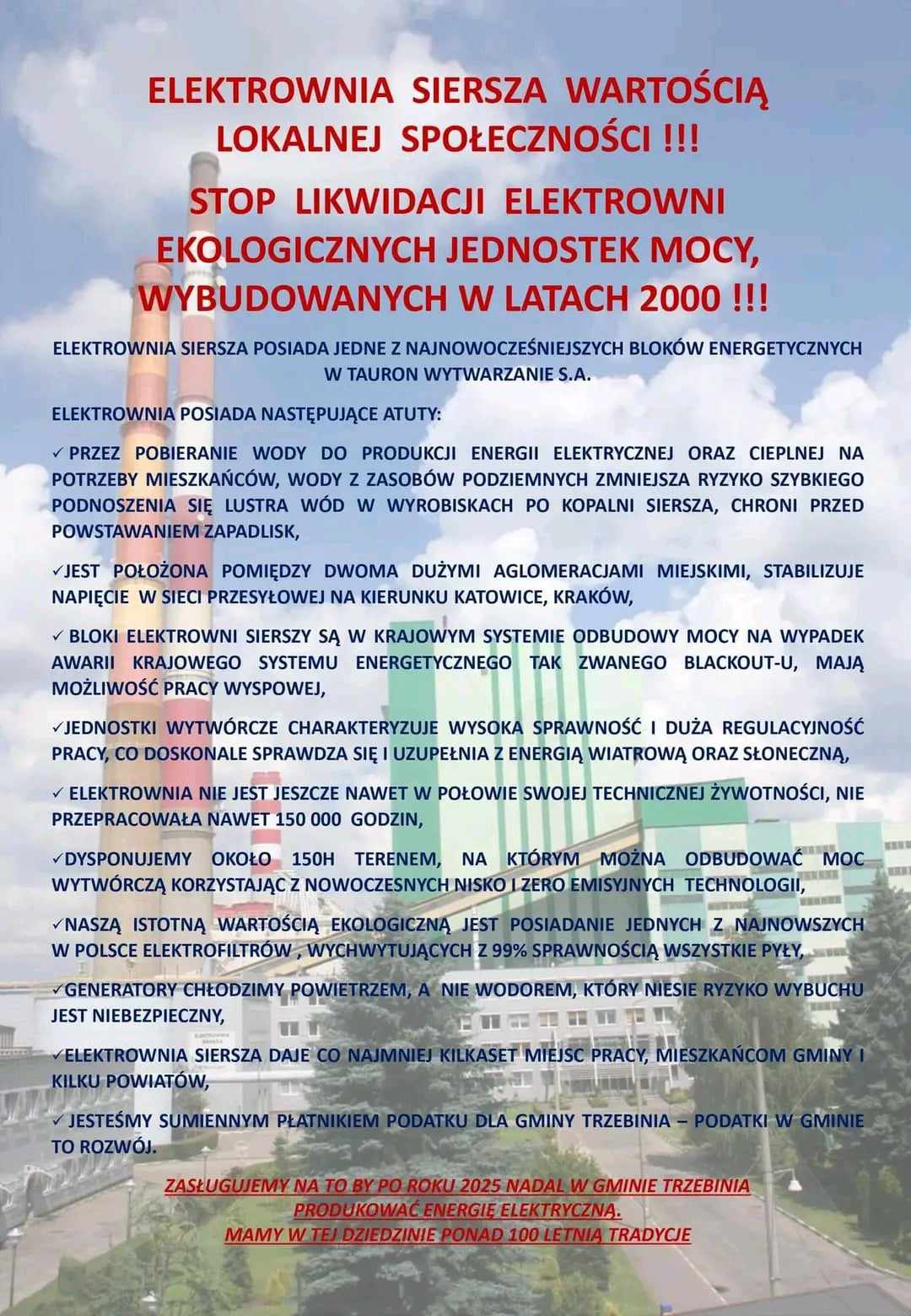 Pracownicy elektrowni liczą na poparcie gminy i chcą uświadomić mieszkańców, jak ważnym są zakładem pracy dla rozwoju regionu. Pracownicy Elektrowni Siersza od 2021 roku walczą o przedłużenie pracy tego zakładu.