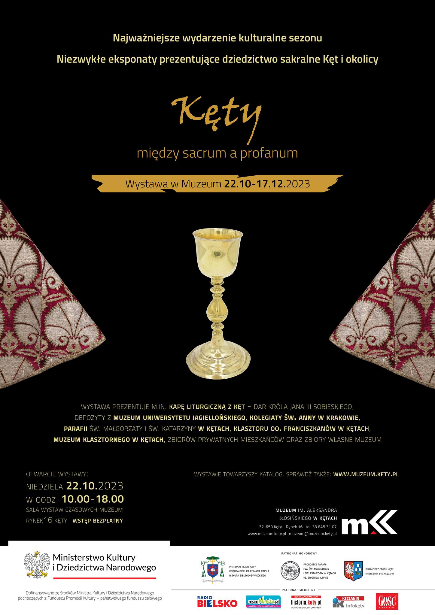 Ekspozycję "Kęty – między sacrum a profanum” zobaczyć można w kęckim muzeum im. Aleksandra Kłosińskiego. Wśród eksponatów jest między innymi liturgiczna kapa, uszyta z aksamitnej tkaniny podarowanej przez króla Jana III Sobieskiego – podała diecezja bielsko-żywiecka.