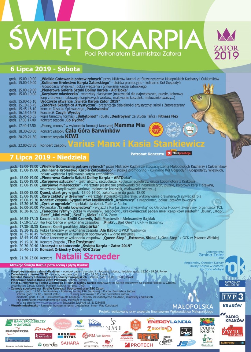 To prawdziwy raj dla smakoszy. Na zatorskim rynku swoje stoiska rozłożyły gospodynie z całej gminy, które przygotowały przysmaki z tej popularnej ryby. Oprócz tradycyjnych ryb pieczonych, są klopsiki, pasty rybne a nawet racuchy karpiowe...Degustacje dań, prezentacje artystyczne i koncerty gwiazd. Zator zaprasza w niedziele na drugi dzień Święta Karpia. Od 15 stoiska na rynku rozłożą gospodynie, które karpia przygotowały na kilkadziesiąt sposobów.