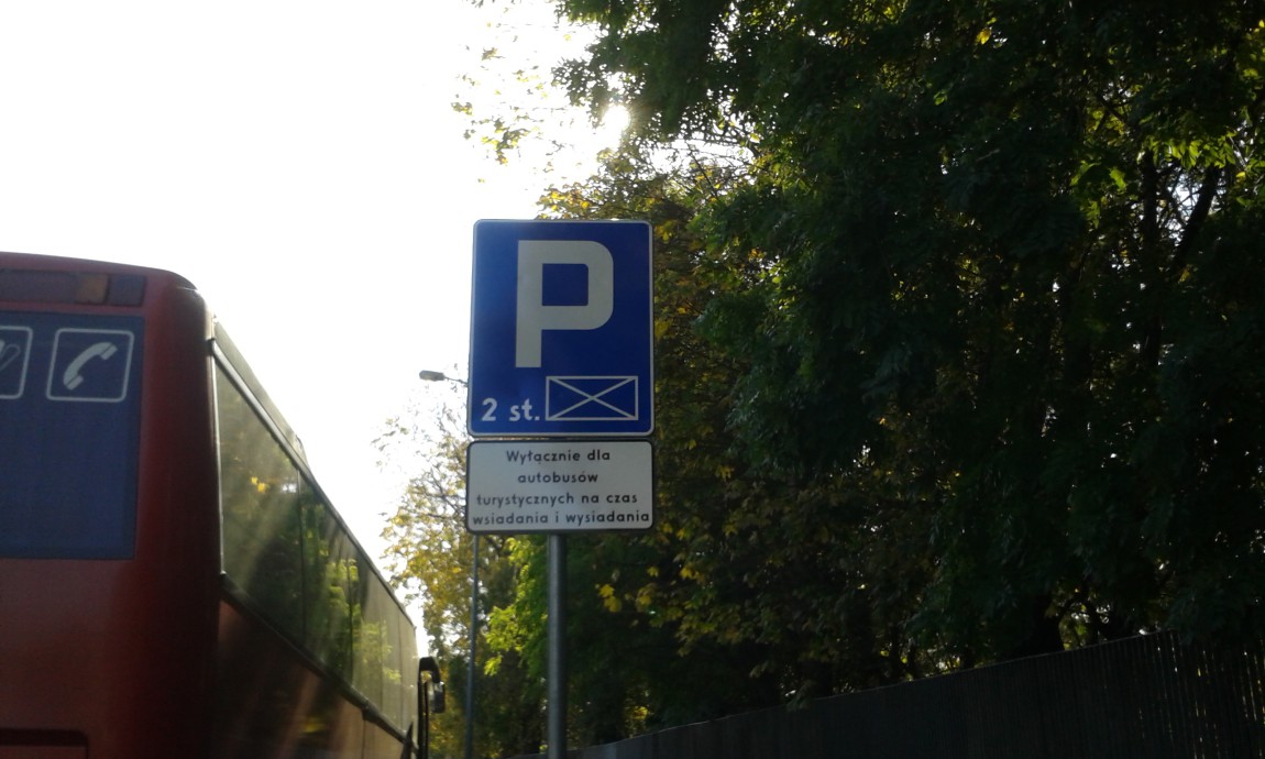 Natomiast kawałek dalej, wzdłuż cmentarza, pojawiły się na jezdni dwie ogromne koperty i postawiono znak informujący o miejscu parkowania dla dwóch autokarów, ale tylko na czas wsiadania i wysiadania pasażerów. Znak znakiem, życie życiem, na ulicy, zajmując cały pas jezdni, parkuje codziennie od trzech do ośmiu /sic!/ autokarów i to nie na czas wsiadania i wysiadania, ale często na kilkadziesiąt minut. Jak dzień zimniejszy, to z włączonym silnikiem. I tak kierowcy autokarów znaleźli sobie darmowy parking w centrum miasta.