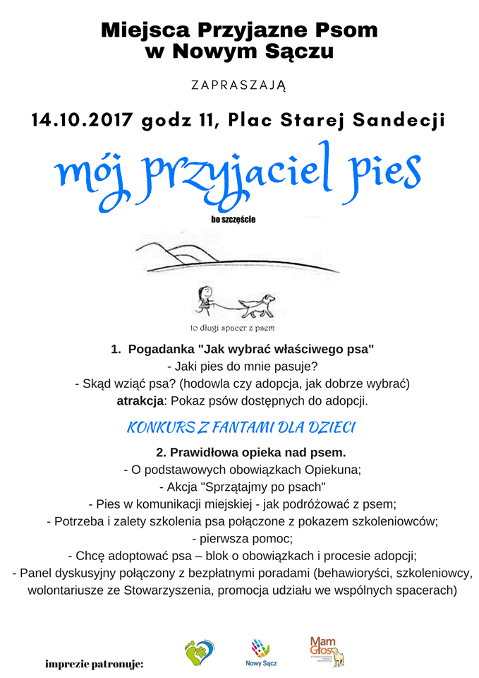 Już ponad 100 hoteli, sklepów i zakładów usługowych dołączyło do listy miejsc przyjaznych psom w Nowym Sączu i okolicach. Listę tworzą wolontariusze, zachęcając właścicieli lokali i oznaczając je specjalnymi naklejkami z logiem akcji.Akcja ma swój profil na portalu Facebook, a jej członkowie spotkają się w najbliższą sobotę (14.10.2017) na placu starej Sandecji przy Al. Wolności w Nowym Sączu.