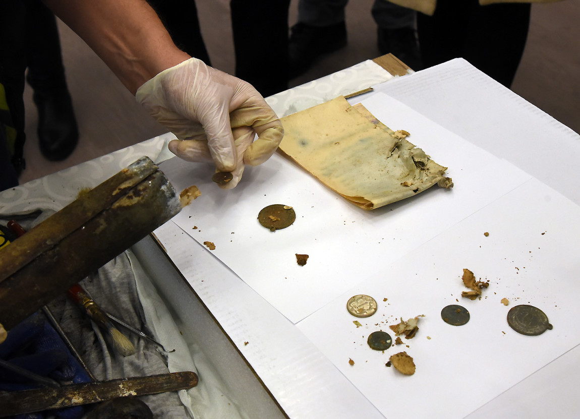 11 monet, dwa medaliony i trzy dokumenty opisujące prace remontowe przy kościele św. Jana Chrzciciela z XIX i początku XX wieku, odkryto w kapsule czasu przy obecnej modernizacji dachu świątyni. Artefakty znajdowały się w blaszanej tubie wykonanej z brązu, która znajdowała się pod krzyżem i kulą. To dla nas niezwykła wiadomość od poprzedników – mówi ks. Czesław Noworolnik, proboszcz parafii w Łącku.