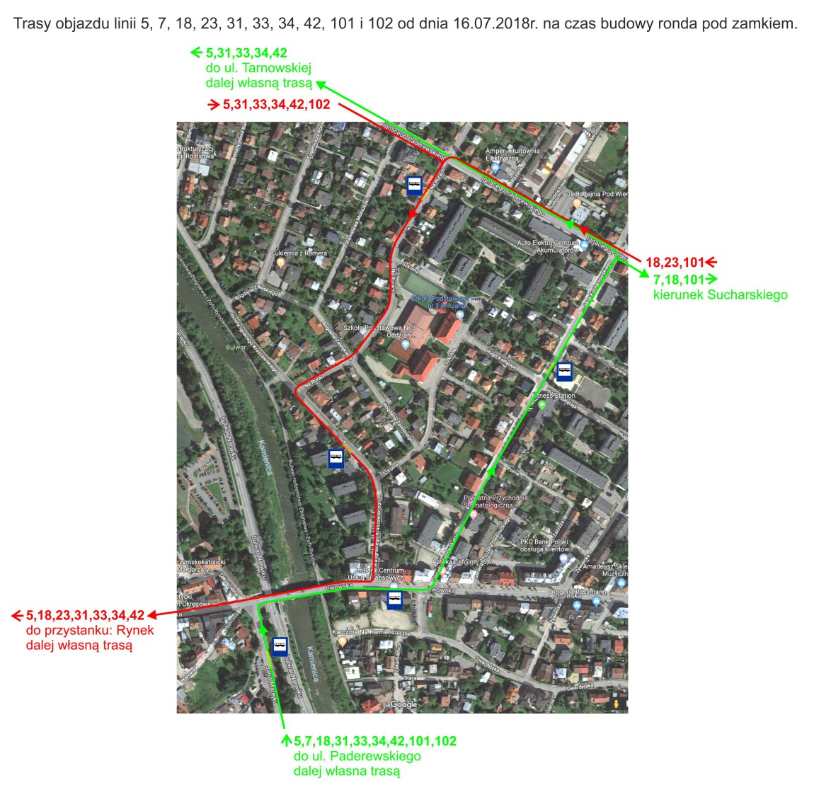 Autobusy, które kursowały do tej pory przez przebudowane skrzyżowanie, będą teraz jeździć począwszy od ulicy Matejki przez most na ul. Lwowskiej, Kochanowskiego do Paderewskiego. W przeciwnym kierunku: z ulicy Paderewskiego przez Na Rurach, Kraszewskiego do ul. Lwowskiej w kierunku Rynku.