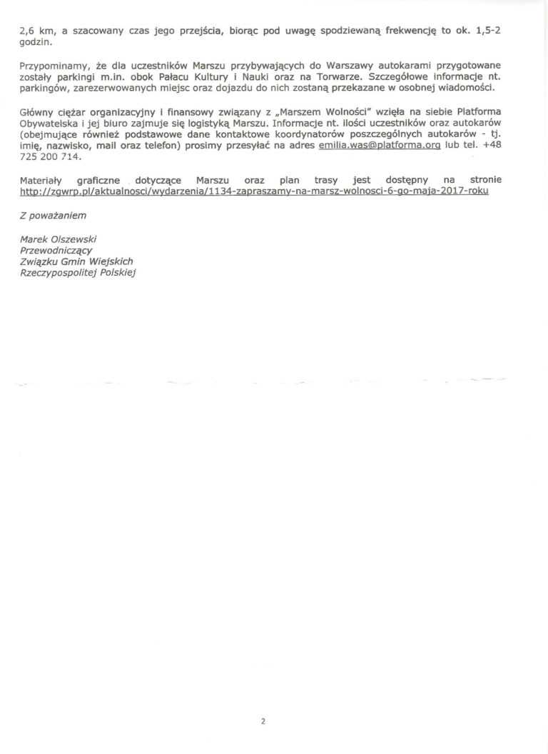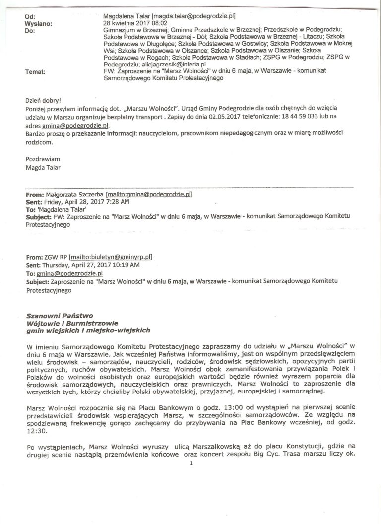 W mailu* czytamy, że gmina Podegrodzie zapewnia darmowy transport do stolicy. Do listu dołączono także komunikat Związku Gmin Wiejskich Rzeczpospolitej Polskiej, z którego wynika, że marsz będzie jednocześnie protestem środowisk nauczycielskich przeciwko reformie oświaty. Dyrekcje placówek zostały także poproszone o rozesłanie informacji do rodziców.