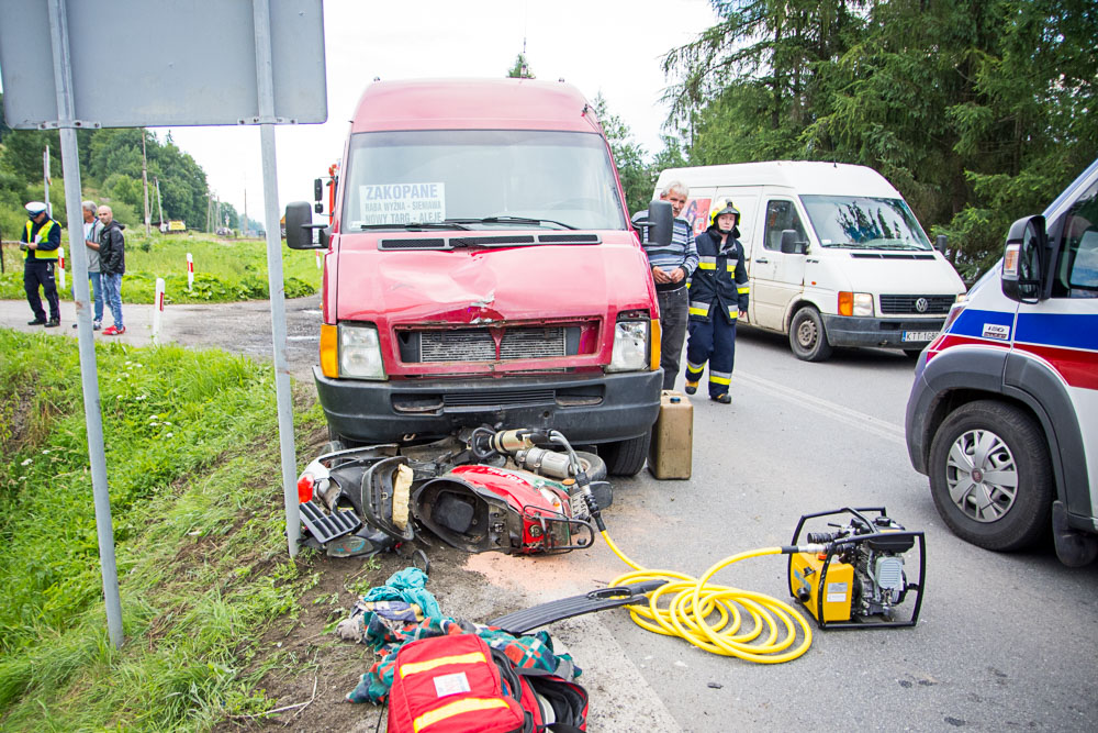 Był to już drugi wypadek z udziałem motocyklisty we wtorek. W godzinach popołudniowych na zakopiance w Białym Dunajcu kierujący skuterem wjechał pod nadjeżdżającego z naprzeciwka busa. Do uwolnienia zakleszczonego motocyklisty trzeba było używać specjalistycznego sprzętu hydraulicznego.
