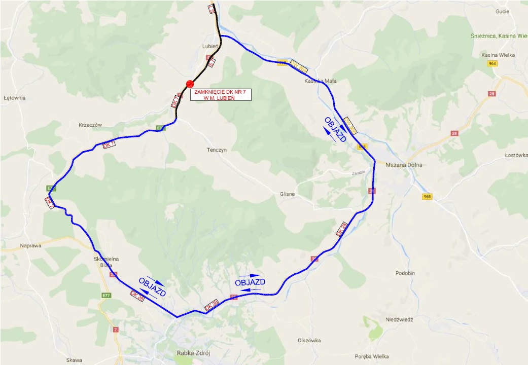 Od poniedziałku do 25 kwietnia zamknięta dla ruchu samochodowego jest popularna Zakopianka na odcinku od Lubnia do Skomielnej Białej. Samochody są kierowane na objazd przez Mszanę Dolną.