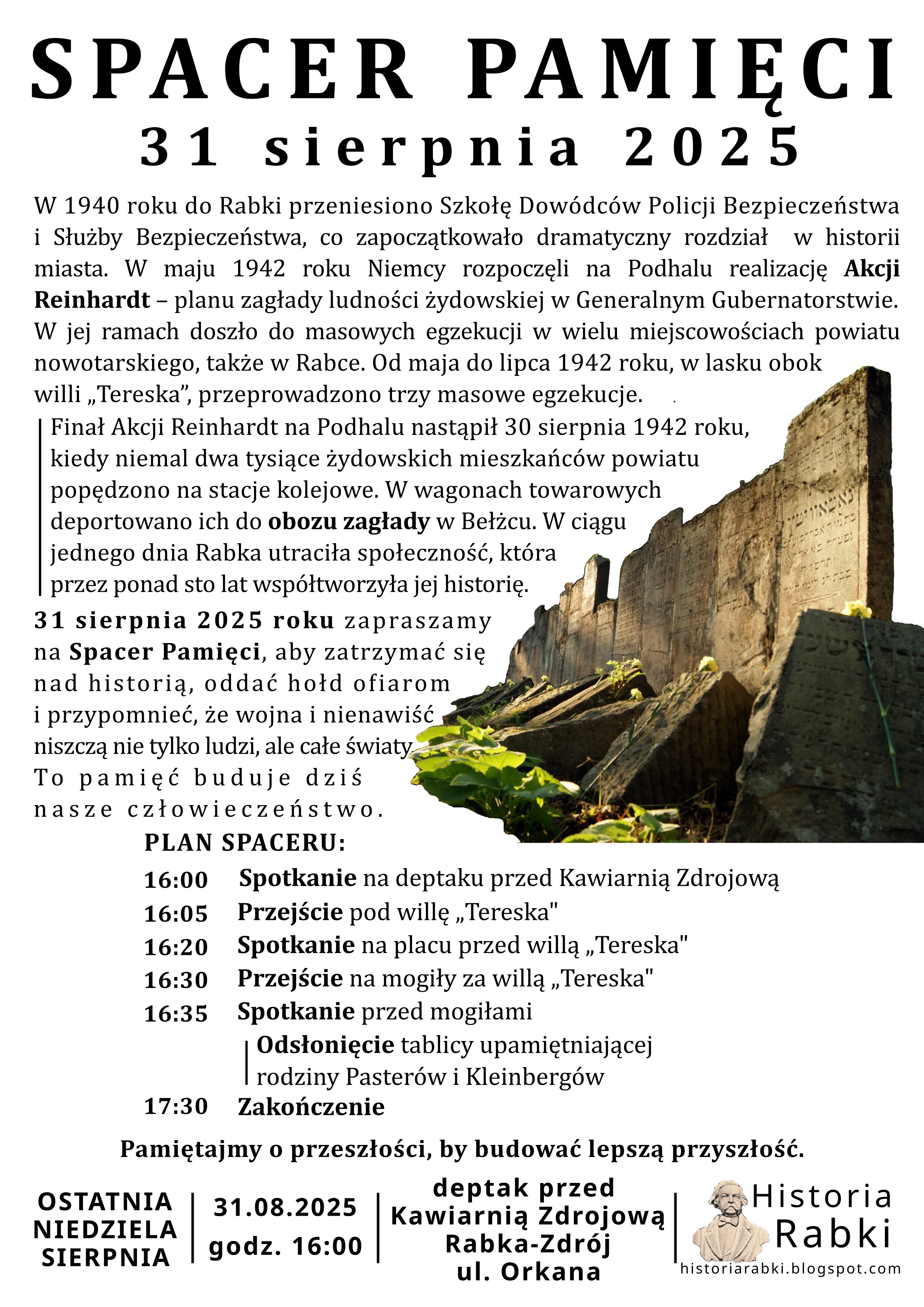 Inicjatorami Spacerów Pamięci są Michał Rapta, Grzegorz Moskal (autorzy książki "Mroczne tajemnice Willi Tereska") i Narcyz Listkowski. Od 2015 roku wraz z zespołem www.historiarabki.blogspot.com starają się okazać szacunek zamordowanym mieszkańcom miasta. Podczas spaceru przybliżają przedwojenną historię żydowskich mieszkańców Rabki, przedstawiają ich życie, a także dramat związany z okupacją Rabki przez Niemców. Spacery mają przypomnieć nie tylko o zagładzie, ale też o codziennym, spokojnym życiu społeczności żydowskiej przed wojną. Zdjęcia i historie rabczańskich rodzin przypominają publikacje rozdawane podczas Spacerów pamięci.