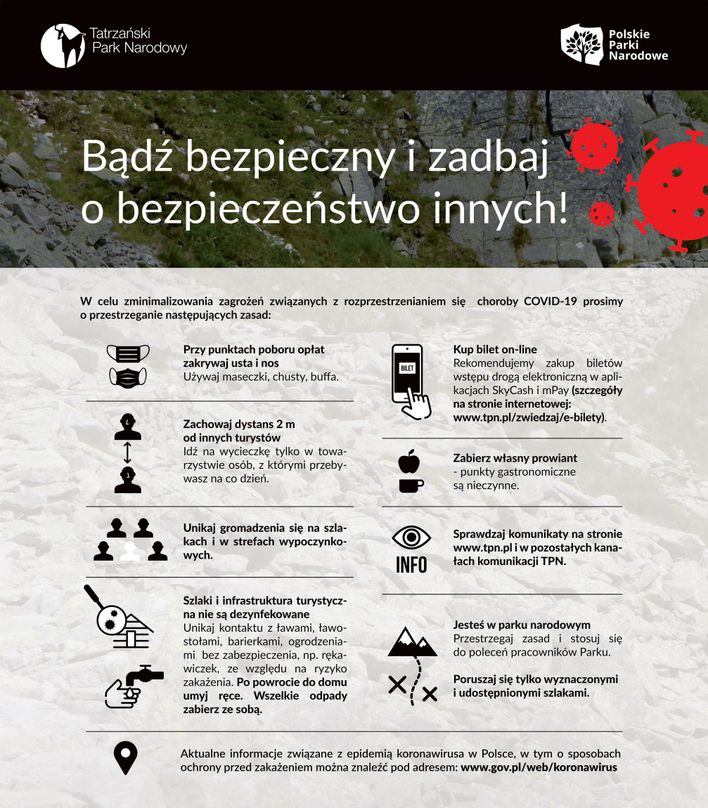 Na tatrzańskich szlakach nie będzie obowiązku używania maseczek, natomiast władze parku zalecają ich używanie na parkingach oraz w punktach sprzedaży biletów.