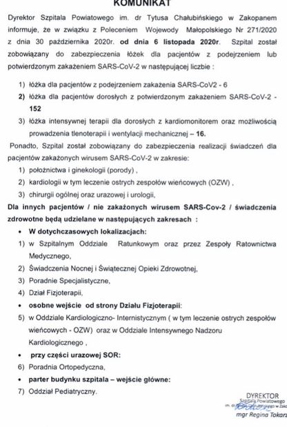 Uwaga - pacjenci zakopiańskiego szpitala