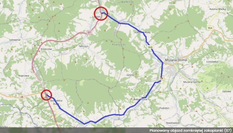 Według informacji przekazanych przez GDDKiA, w czasie zamknięcia obiektu ruch zostanie poprowadzony objazdem – z węzła Lubień drogą wojewódzką nr 968 do Mszany Dolnej, a następnie drogą krajową nr 28 do węzła Skomielna Biała. Na skrzyżowaniach w Skomielnej Białej i Mszanie Dolnej ruchem będzie kierowała policja.