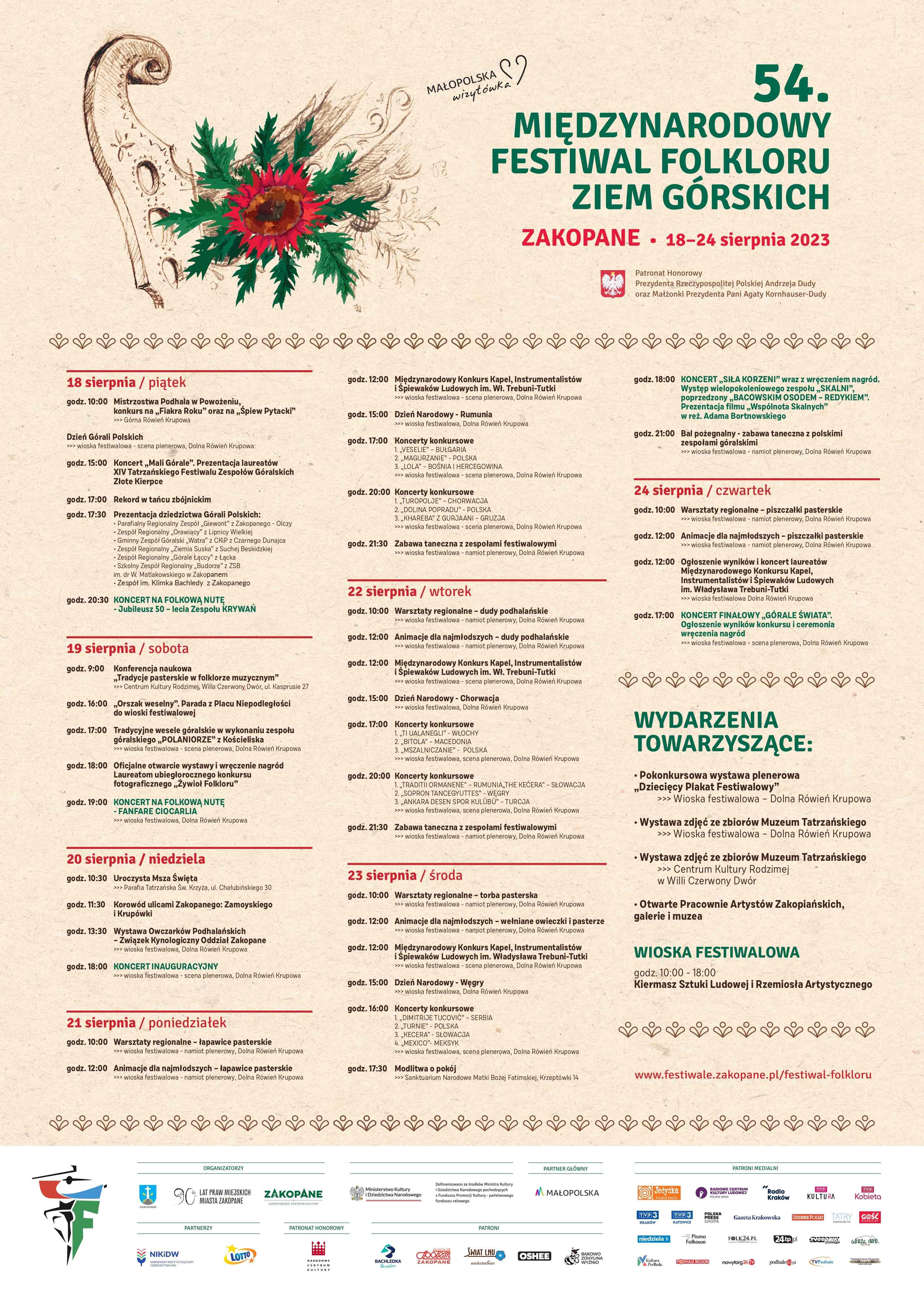 W sobotę kolejne imprezy towarzyszące, a w niedzielę oficjalne otwarcie festiwalu – barwny korowód uczestników przejdzie przed publicznością zakopiańskimi Krupówkami, a wieczorem czeka nas koncert inauguracyjny.