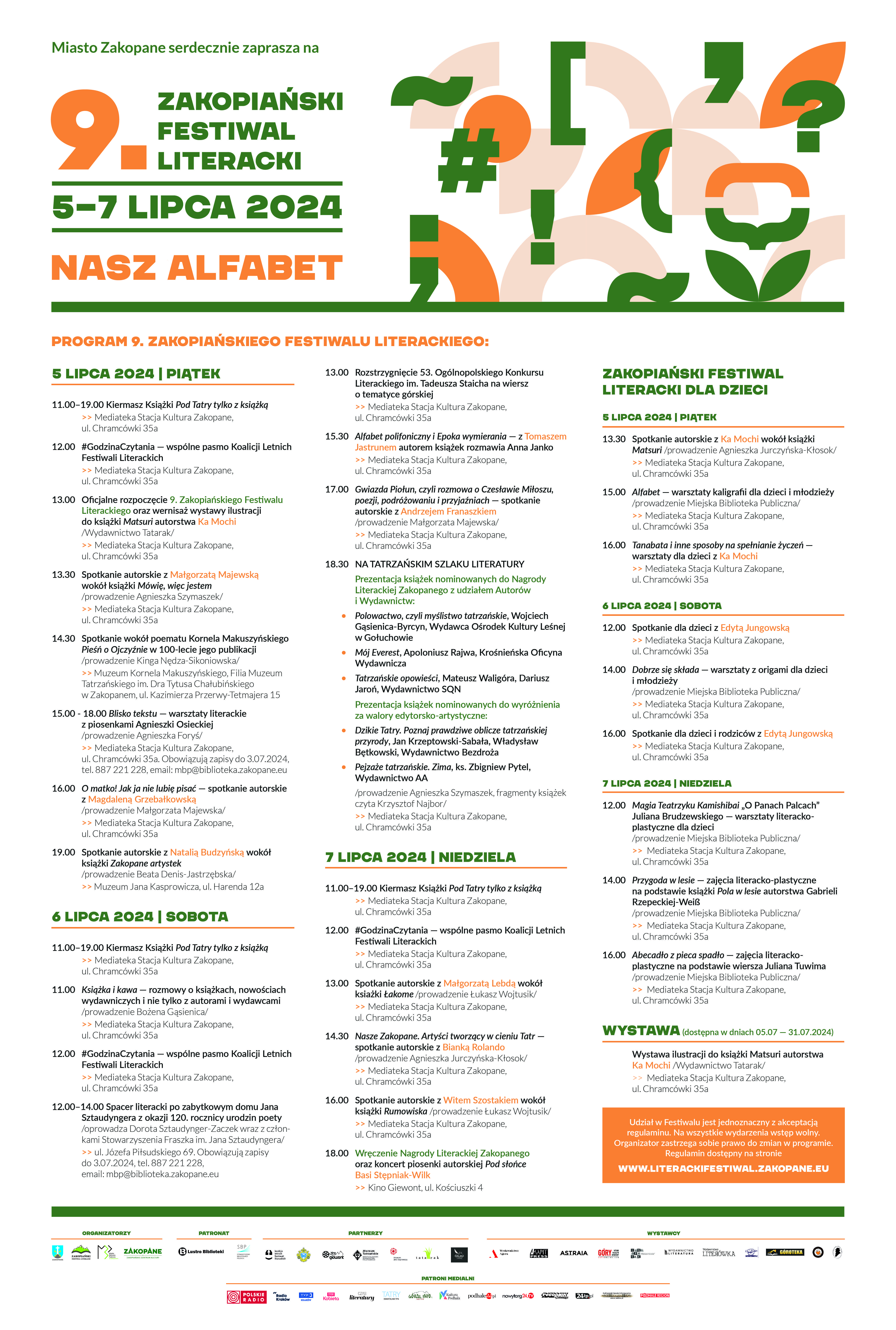 Większość wydarzeń odbywa się w Mediatece Stacji Kultura Zakopane na Chramcówki 35a. Zaplanowano także spotkania w Muzeum Jana Kasprowicza na Harendzie i w Muzeum Kornela Makuszyńskiego, a także spacer literacki po domu Jana Sztaudyngera. Przewidziano także liczne atrakcje dla dzieci m.in. zajęcia z kaligrafii czy origami i spotkanie z Edytą Jungowską.