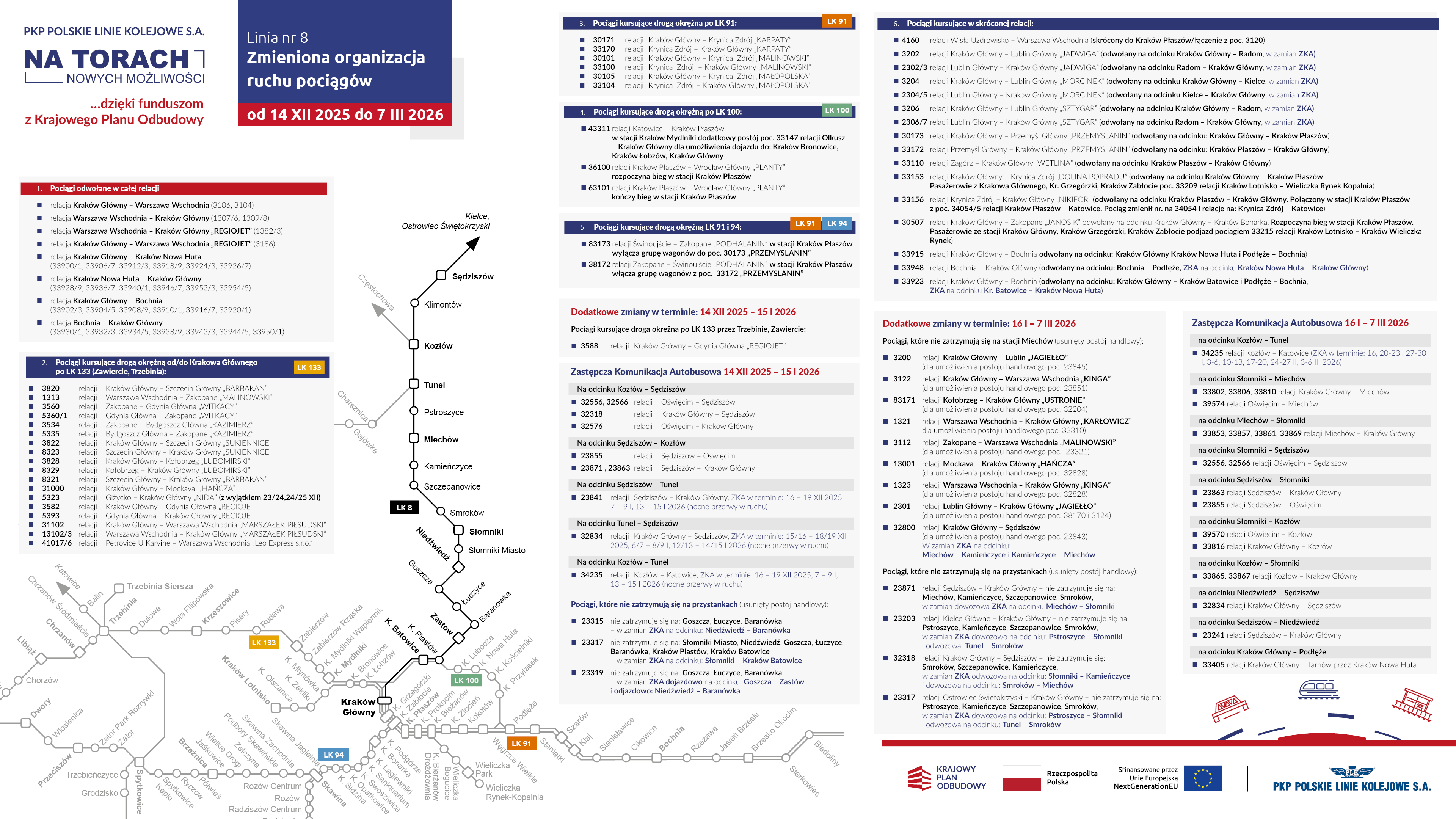 W kolejnych miesiącach coraz bardziej rozległe będą prace modernizacyjne prowadzone przez PKP PLK na linii kolejowej nr 8 (Kraków-Kielce-Warszawa). Są one związane z wymianą infrastruktury torowej oraz urządzeń sterowania ruchem kolejowych. W związku z tym, w trakcie obowiązywania pierwszej korekty w rozkładzie jazdy 2025/26, zmianie ulegać będzie układ zaplanowanych zamknięć torów, czego konsekwencją będą zmiany rozkładu jazdy w poszczególnych okresach.