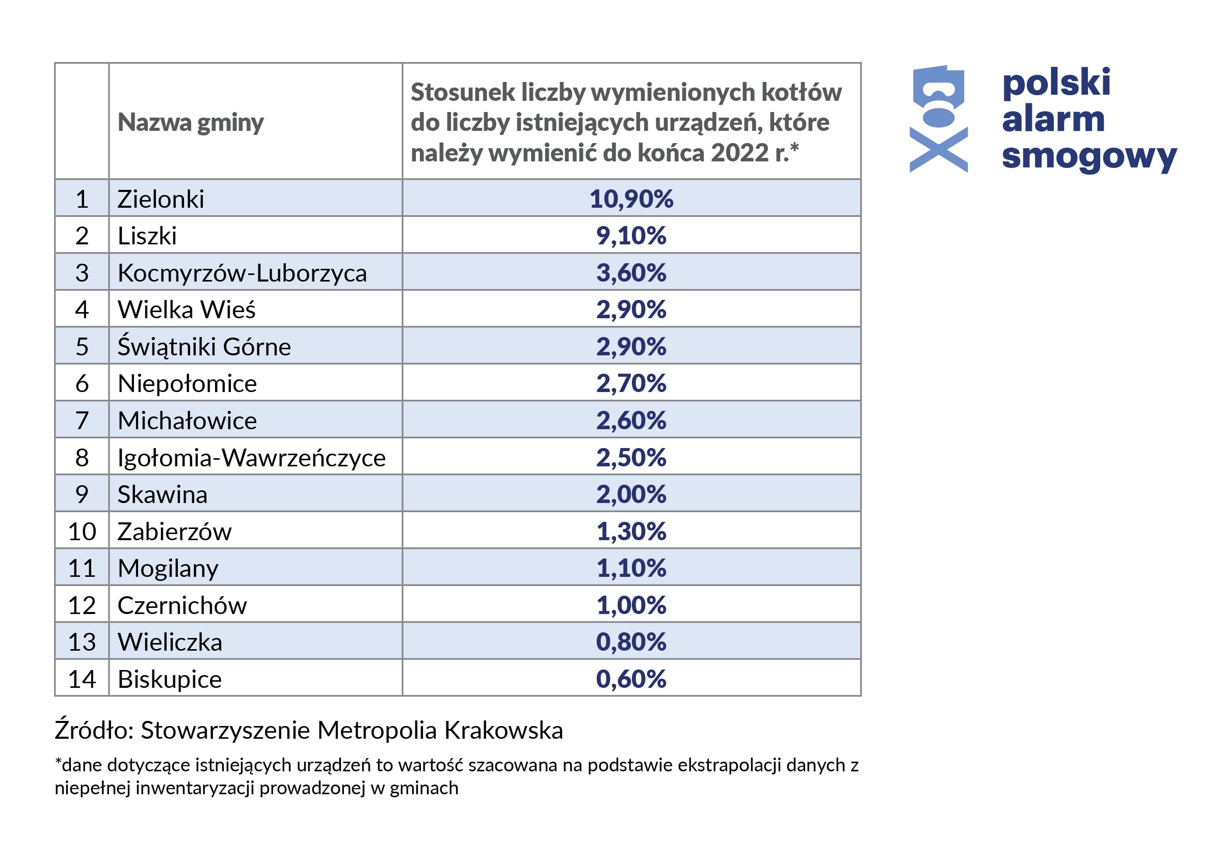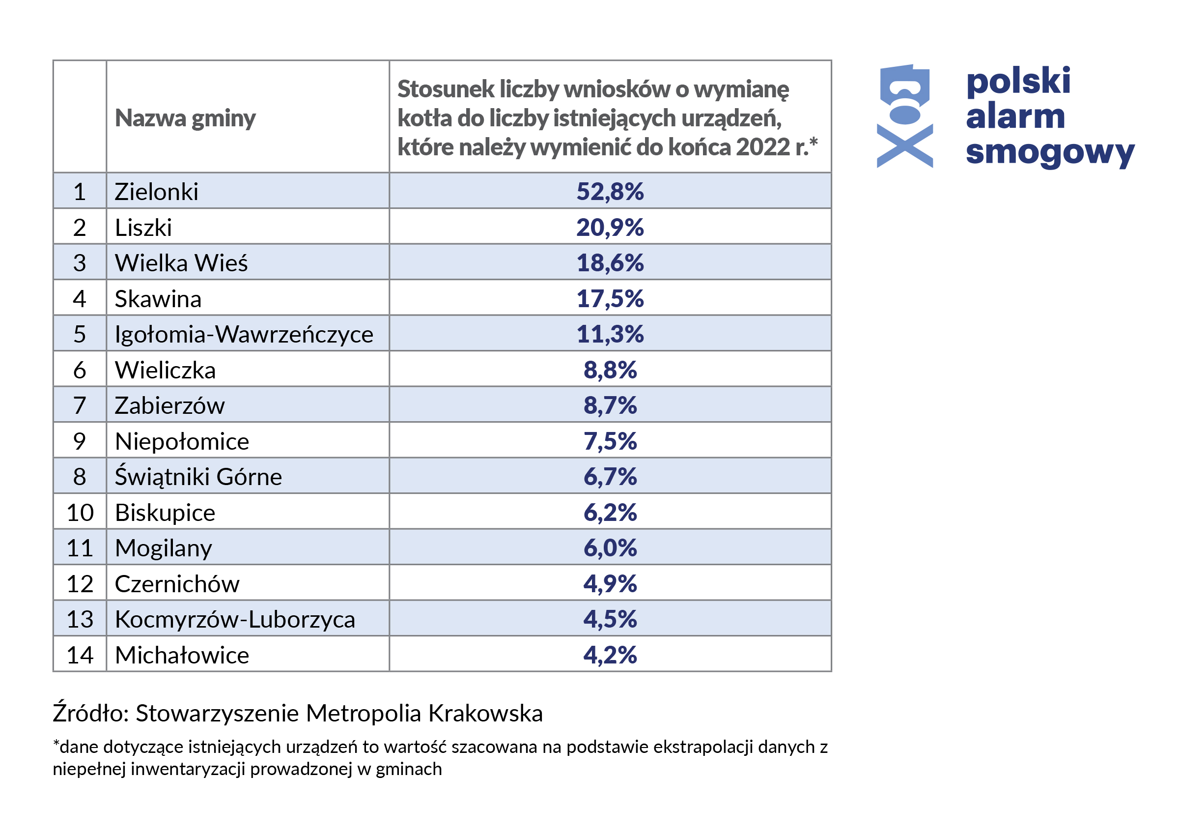 Ekspertka dodaje jednak, że w ostatnim półroczu w Liszkach, Zielonkach i Skawinie znacznie wzrosła liczba wniosków o dotacje do wymiany pieców. Jeśli takie tempo zostanie utrzymane, to właśnie gminy takie jak Zielonki, Liszki, Wielka Wieś i Skawina mają szansę poradzić sobie z tym zadaniem przed upływem ostatecznego terminu zawartego w uchwale.