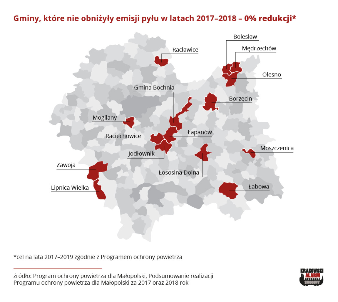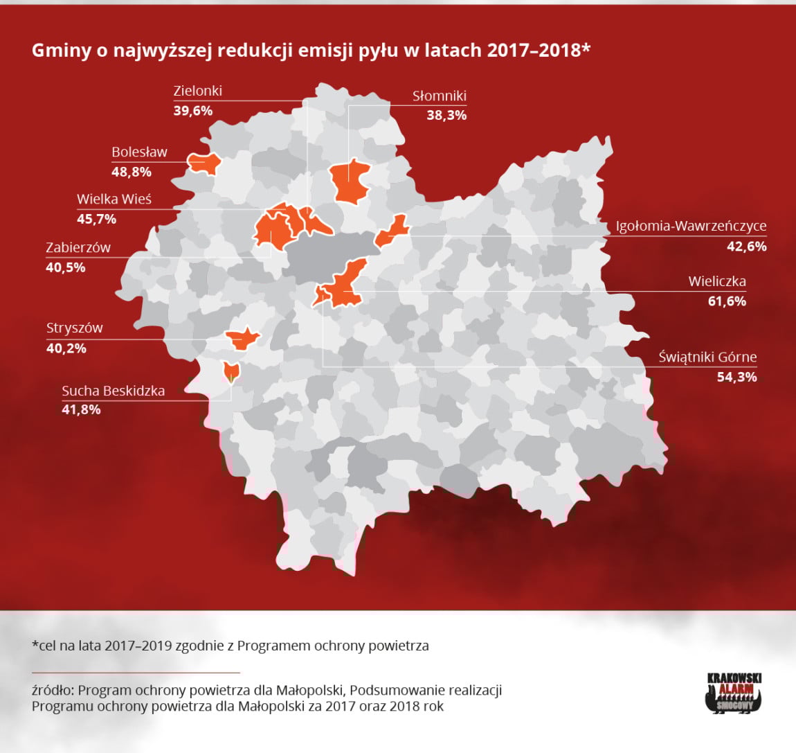 Trzyletni Program Ochrony Powietrza na lata 2017 - 2019, który zakłada redukcję pyłu PM10, w tej chwili powinien być wykonany w 66 procentach. Najbliżej tej wartości jest Wieliczka, która wykonała 62 procent planu i Świątniki Górne z wartością 54 procent. Bardziej niepokojące jest jednak to, że w Małopolsce wciąż są gminy, które nie wymieniły ani jednego kopciucha. Do tego niechlubnego grona zalicza się między innymi podkrakowska gmina Mogilany, Zawoja czy Lipnica Wielka.