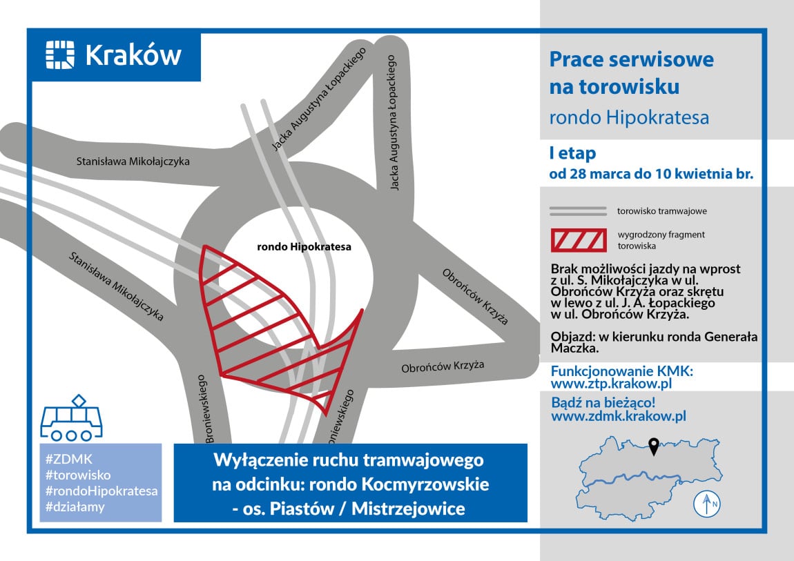 - wyłączona zostanie komunikacja tramwajowa na odcinku Rondo Kocmyrzowskie – os. Piastów/Mistrzejowice (szczegóły pojawią się w komunikacie Zarządu Transportu Publicznego);