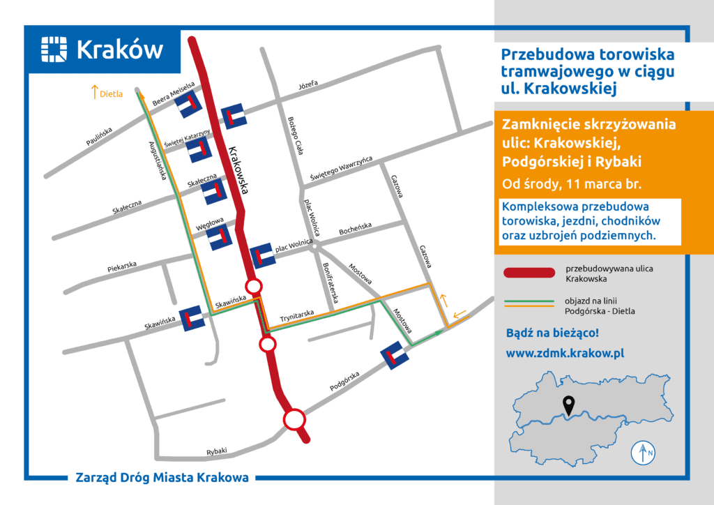 Tymczasowy objazd będzie prowadził ulicami: Trynitarską, Krakowską (fragmentem placu budowy) i Skawińską. Planowany termin przywrócenia stałej organizacji ruchu na tym skrzyżowaniu to połowa maja br.