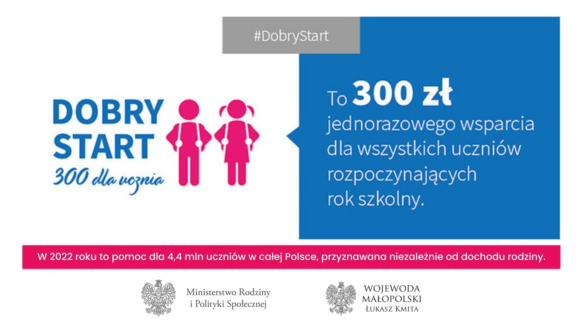 – Rządowy program „Dobry start” to inwestycja w edukację. Wniosek może złożyć rodzic, opiekun prawny dziecka lub opiekun faktyczny dziecka. Wniosek o świadczenie dla dzieci, które przebywają w pieczy zastępczej, składa rodzic zastępczy, osoba prowadząca rodzinny dom dziecka lub dyrektor placówki opiekuńczo-wychowawczej. Co ważne, aby otrzymać wsparcie, nie trzeba spełniać żadnych warunków finansowych. Wyprawka należy się każdemu uczniowi bez kryterium dochodowego. Złożenie wniosku w ciągu najbliższych 3 tygodni daje gwarancję otrzymania 300 zł do końca września. W Małopolsce wypłacono prawie 73 mln zł na potrzeby blisko 243 tys. dzieci – mówi wojewoda małopolski Łukasz Kmita.