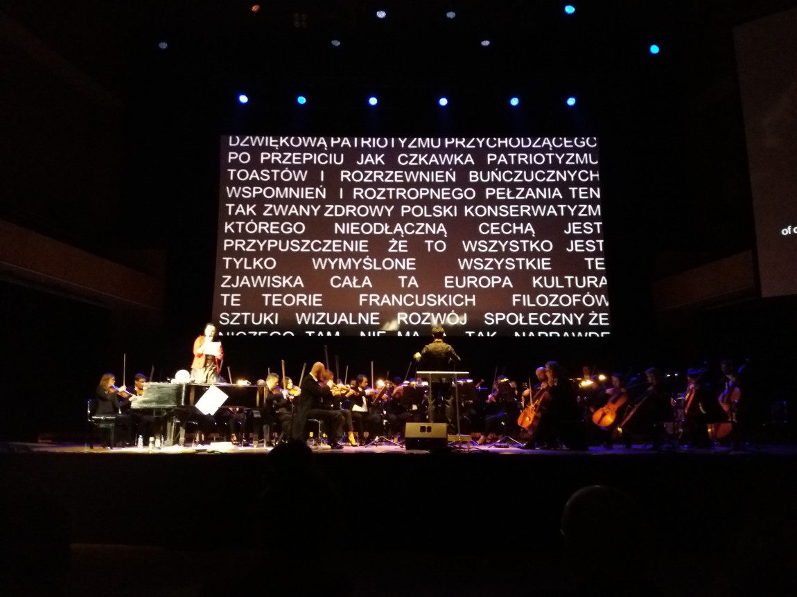 Tekst, za który odpowiada Barbara Wysocka i Michał Zadara jest pewnego rodzaju kolażem różnych sposobów mówienia o muzyce. Kolażem bardzo ciekawym i dającym sporo do myślenia. Był on inspirowany wieloma źródłami, w tym m.in. wywiadami z takimi pianistami jak Jerzy Sterczyński, Janusz Olejniczak czy Maciej Grzybowski, a także rozmowami z muzykologami Marcinem Gmysem i Moniką Pasiecznik. Z tego materiału artyści złożyli zdania w całe akapity w taki sposób, by tekst opowiedział muzykę i emocje, korespondując jednocześnie z partią orkiestry.