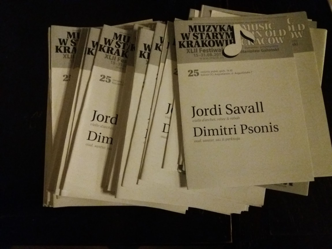 Został uhonorowany przez UNESCO tytułem Artysta dla Pokoju. Jego projekty, choć muzyczne, mocno wykraczają poza muzykę i stają się opowieścią pokazującą co łączy z pozoru odrębne kultury; są dowodem na to jak wiele kultura Zachodniej Europy ma wspólnego z Bliskim Wschodem. Jego występy, to znacznie więcej niż zwykłe koncerty. Choć to opowieść o historycznych postaciach bądź miejscach ułożona z utworów dawnych czasów, to przede wszystkim ważny głos współczesnego artysty, który sięgając do przeszłości stara się zbudować lepszą teraźniejszość. Jordi Savall, legendarny kataloński gambista i odkrywca zapomnianej muzyki wystąpił w piątek 25 sierpnia w ramach 42. Festiwalu „Muzyka w starym Krakowie”.Katalońskiemu artyście, który grał na trzech instrumentach: vielle d’archet, rebec i rebab towarzyszył Dimitri Psonis na takich instrumentach jak: oud, santur, saz i perkusja. Wykonane zostały m.in.: tradycyjne utwory Afganistanu, Armenii czy Persji, wyróżniające się wzruszającą linią melodyczną włoskie Lamento di Tristano czy Koniali, utwór znany jako piosenka lub taniec w Turcji i Grecji. Niezwykła muzyka brzmiąca w przepięknym surowym wnętrzu kościoła robiła wielkie wrażenie. Doceniła to publiczność gotując artystom owację na stojąco. Jordi Savall nie dał się długo prosić. Na bis opowiedział o instrumentach, jakie artyści używali. Najwięcej ciekawości wzbudził rebab, instrument, który jest uważany za arabski jak i hinduski, turecki, uzbecki, a także był popularny w osmańskiej Turcji. Uwagę przyciągnął także perski lub indyjski santur, instrument strunowy na którym gra się pałeczkami (przypominał znane w dawnej Polsce cymbały). Na bis zabrzmiała też muzyka: kołysanka, która uważana jest za tradycyjna melodię w wielu krajach Morza Śródziemnego. Skąd więc naprawdę pochodzi? To pytanie Jordi Savall pozostawił bez odpowiedzi.