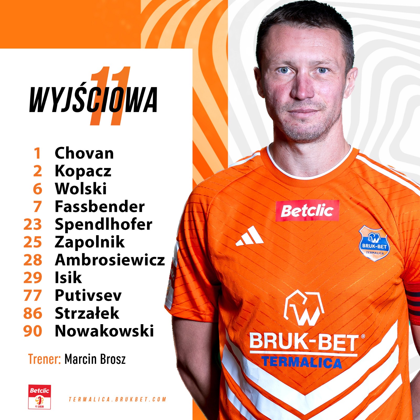 Bruk – Bet Termalica: 1 Adrian Chovan – 2 Bartosz Kopacz (68 3 Arkadiusz Kasperkiewicz), 77 Artem Putiwcew, 23 Lukas Spendlhofer – 6 Maciej Wolski, 28 Maciej Ambrosiewicz, 86 Igor Strzałek (76 39 Dominik Biniek), 90 Jakub Nowakowski (76 13 Krzysztof Kubica), 29 Gabriel Isik – 7 Morgan Fassbender (61 10 Kacper Karasek), 25 Kamil Zapolnik (61 53 Andrzej Trubeha).