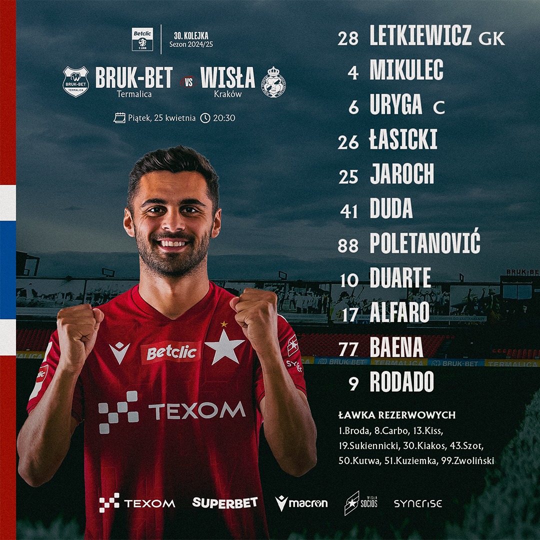 Wisła Kraków: 28 Patryk Letkiewicz – 25 Bartosz Jaroch, 6 Alan Uryga, 26 Igor Łasicki, 4 Rafał Mikulec – 77 Ángel Baena (88 13 Tamas Kiss), 41 Kacper Duda, 17 Jesús Alfaro (59 99 Łukasz Zwoliński), 88 Marko Poletanović (59 8 Marc Carbó), 10 Frederico Duarte (83 19 Oliwier Sukiennicki) – 9 Ángel Rodado.