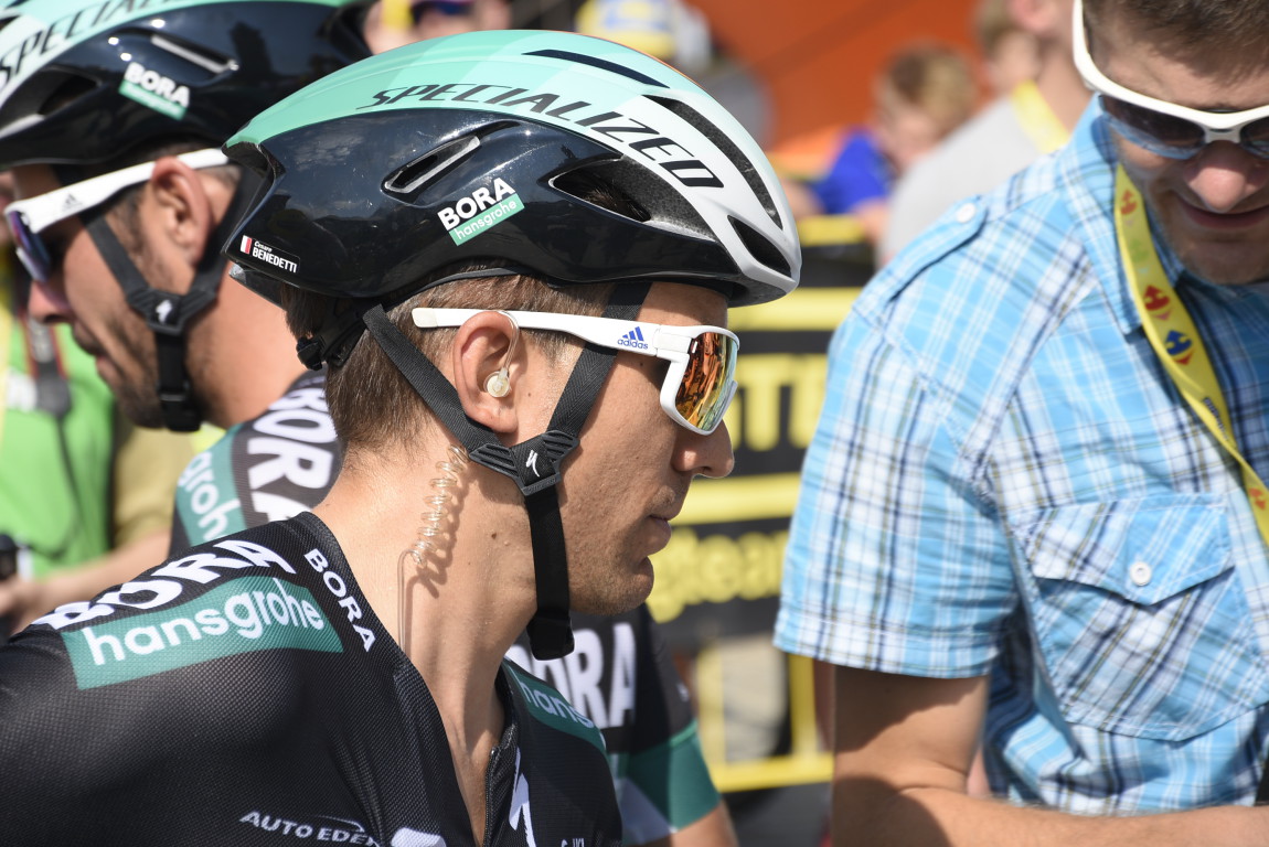 17.03 - Kolarze cały czas wiedzą, co dzieje się w peletonie. Także za sprawą komunikacji radiowej (co widać po słuchawce w uchu Benedettiego)