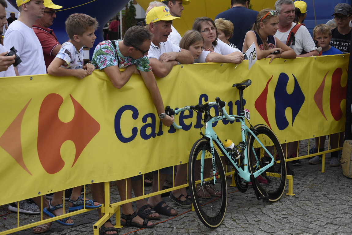 17.40 - Z powodu zamieszania na starcie kolumna reklamowa została z tyłu peletonu. Zazwyczaj poruszają się z przodu, przed kolarzami, żeby moglirozdać przygotowane gadżety.