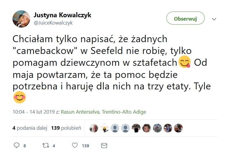 Małopolska biegaczka, dziś trenerka kobiecej kadry potwierdza, że zamierza wystąpić w Mistrzostwach Świata w narciarstwie klasycznym w Austrii! Kowalczyk jednak podkreśla: "...żadnych camebacków w Seefeld nie robię, tylko pomagam dziewczynom w sztafetach".