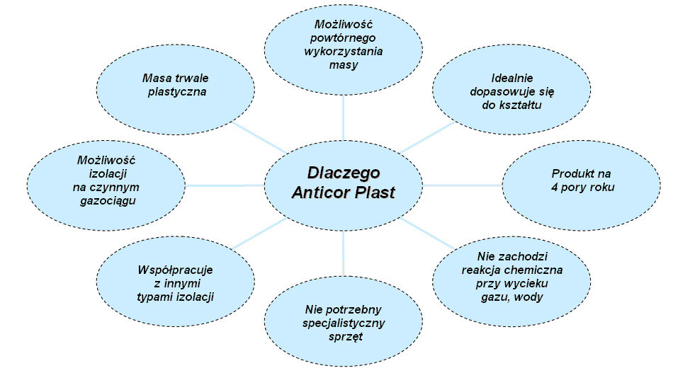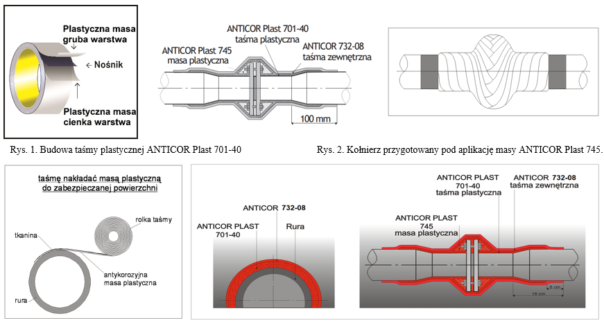 Ponieważ technologia nakładania systemu jest bardzo prosta i nie wymaga posiadania specjalistycznego sprzętu, a prace mogą być prowadzone na czynnym rurociągu, co w wielu sytuacjach jest wielkim udogodnieniem dla inwestora i pozwala na obniżenie kosztów związanych z wyłączeniem odcinka rurociągu z eksplantacji. Stale plastyczna masa ANTICOR Plast 745 ułatwia nakładanie powłoki przez cały rok (również w niskich temperaturach), dzięki czemu użytkownik ma łatwość dopasowania powłoki do kształtów zabezpieczanej powierzchni. W swym składzie zawiera inhibitor korozji, oraz pakiet dodatków polepszający przyczepność do stali i tworzyw sztucznych, dzięki czemu zawsze mamy pewność, że nałożony materiał bardzo dokładnie zabezpiecza przed czynnikami, które są przyczyną korozji. Materiały ANTICOR Plast są obojętne dla człowieka i środowiska (posiadają atest PZH). Produkowane są na bazie głęboko rafinowanych produktów petrochemicznych, dzięki czemu gwarantuje to stabilność produktu w całym okresie użytkowania. System ANTICOR Plast jest odporny na działanie wilgoci i wody zapewniając minimalną paroprzepuszczalność. Posiada również bardzo wysoką oporność elektryczną, dlatego jest skuteczną barierą dla prądów błądzących, które w konsekwencji mogą doprowadzić do perforacji powierzchni rur oraz armatury.