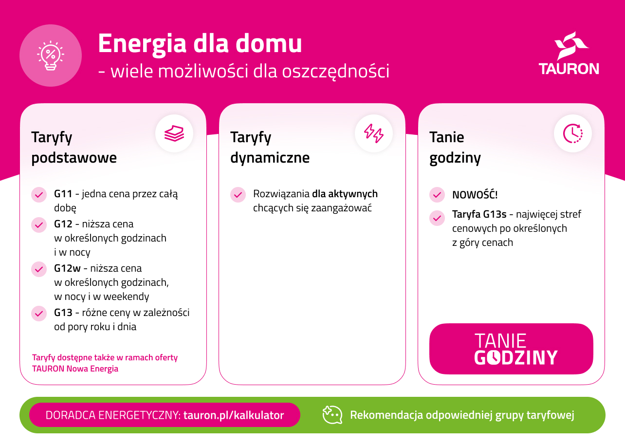 Eksperci Taurona przypominają, że energia elektryczna może być oferowana w różnych wariantach. Gospodarstwa domowe mogą korzystać z grupy taryfowej, w której cena prądu jest taka sama przez cały dzień, ale mogą również wybrać taki rodzaj rozliczeń, w którym cena prądu jest różna i zależy od pory dnia. Grupa taryfowa powinna być dostosowana do stylu życia i harmonogramu dnia mieszkańców gospodarstwa domowego.