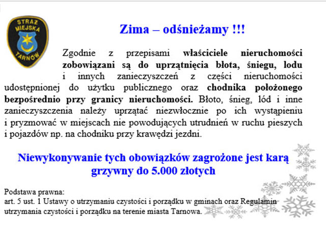 To nowy pomysł tarnowskiej Straży Miejskiej, której funkcjonariusze od początku sezonu rozdali już ponad dwieście takich kartek. - Są tam zasady, o których każdy właściciel domu powinien pamiętać - mówi Krzysztof Tomasik, komendant tarnowskich strażników – Przypominają o obowiązkach wynikających z sezonu zimowego, czyli odśnieżanie chodników oraz ulic i dbanie o swoją posesję.