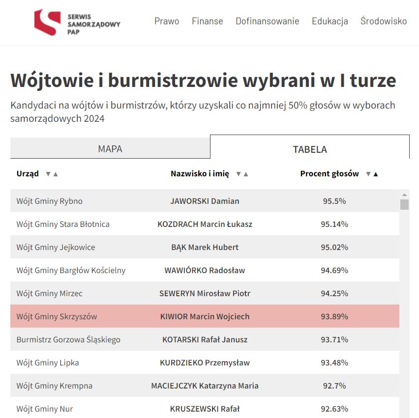 Marcin Kiwior w wyborach z wynikiem 93,89% głosów uplasował się na szóstym miejscu w całym kraju wśród zdobywców najlepszych wyników wyborczych. W gminach powyżej 10 tysięcy mieszkańców jego wynik był najlepszy w Polsce.