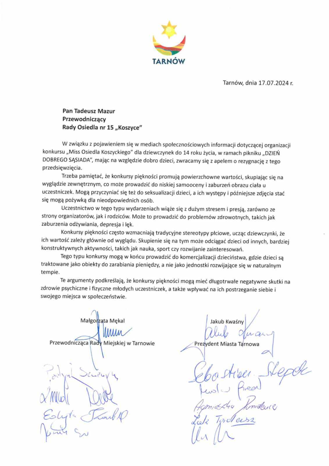W apelu władz Tarnowa czytamy, że organizacja konkursu Miss Osiedla Koszyce dla dziewczynek do 14. roku życia może prowadzić do niskiej samooceny i zaburzeń obrazu ciała u uczestniczek, a także, że taki konkurs może też przyczynić się do seksualizacji dzieci.