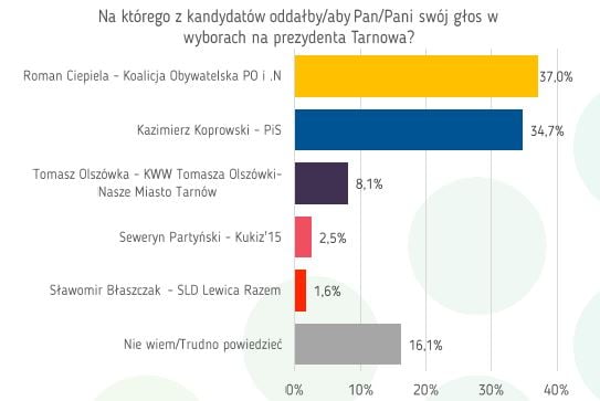 W pierwszej turze wyborów na prezydenta Tarnowa realną szansę na wygraną ma dwóch kandydatów: Roman Ciepiela (KO), na którego chce zagłosować w pierwszej turze 37% respondentów, i Kazimierz Koprowski, który może liczyć na poparcie blisko 35%. W II turze przewaga urzędującego prezydenta się powiększa. Sondaż dla Radia Kraków na próbie tysiąca osób opracował Instytut Badań Rynkowych i Społecznych.Pozostali kandydaci raczej nie mają szans na wejście do 2. tury wyborów. Decydujące o kolejności mogą być jednak głosy ponad 16% niezdecydowanych respondentów.