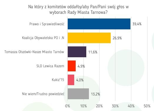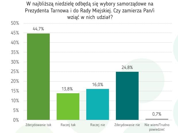 Udział w wyborach na Prezydenta Tarnowa i do Rady Miejskiej deklaruje łącznie niespełna 59% ankietowanych, przy czym zdecydowanie chce oddać swój głos prawie 45%. Do urn nie wybrałoby się 45%, przym czym zdecydowanie twierdzi tak 1/4 pytanych.