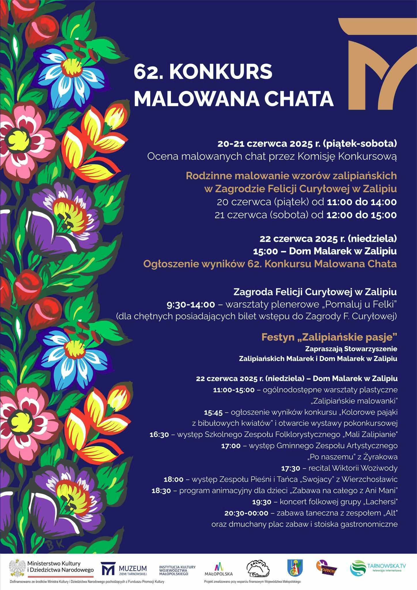 Finał 62. edycji Konkursu "Malowana Chata" odbędzie się w niedzielę 22 czerwca 2025 roku. Wydarzeniu towarzyszyć będą m.in. warsztaty plastyczne, festyn z zabawą taneczną oraz wiele atrakcji dla całych rodzin.