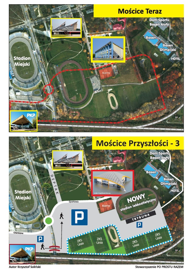 "Po ludzku, boimy się korków. Zakładamy, że będą tu organizowane imprezy nawet na 5 tysięcy osób, a co za tym idzie, przynajmniej tysiąc samochodów będzie chciało zaparkować jak najbliżej hali Jaskółka" - mówił Krzysztof Soliński, przedstawiciel mościckiego stowarzyszenia " Po prostu Razem". Jego członkowie sami przygotowali dla tarnowskiego magistratu propozycję - i projekt ronda w okolicach stadionu żużlowego, i nowej drogi. Proponują rondo na skrzyżowaniu Chemicznej i Czerwonych Klonów i drogę przez obecny stadion lekkoatletyczny.