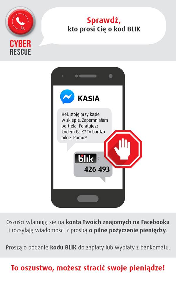 Mniej szczęścia miała jednak młoda, 21-letnia mieszkanka powiatu tarnowskiego. Za pośrednictwem komunikatora czatowała ze swoją przyjaciółką, która poprosiła ją o pomoc przy potwierdzeniu transakcji kodem BLiK. Dziewczyna dwukrotnie zatwierdziła dokonaną przez przyjaciółkę transakcję, przekazując w sumie kwotę 1000 złotych. Dopiero później zorientowała się, że informacje wysyłane za pośrednictwem komunikatora były od obcej osoby, ponieważ konto jej przyjaciółki zostało zhakowane.